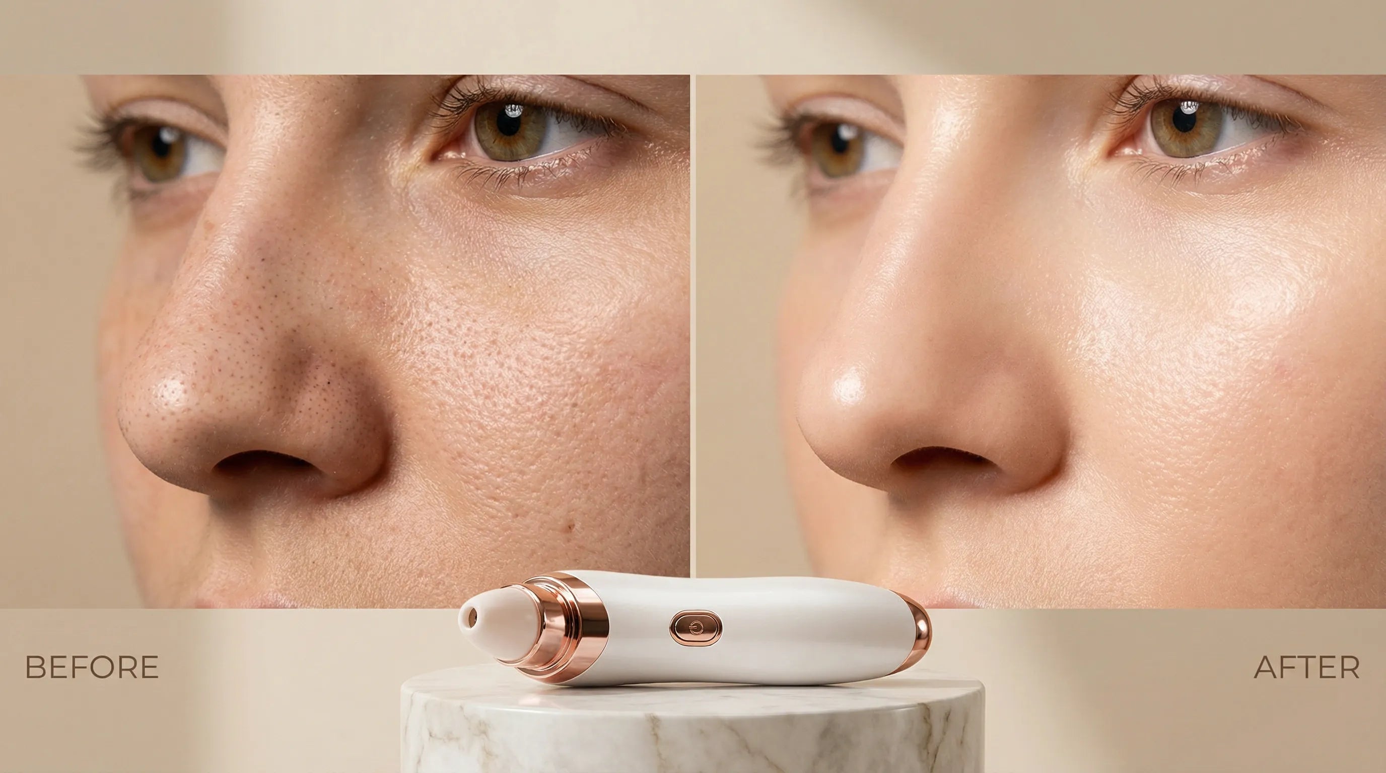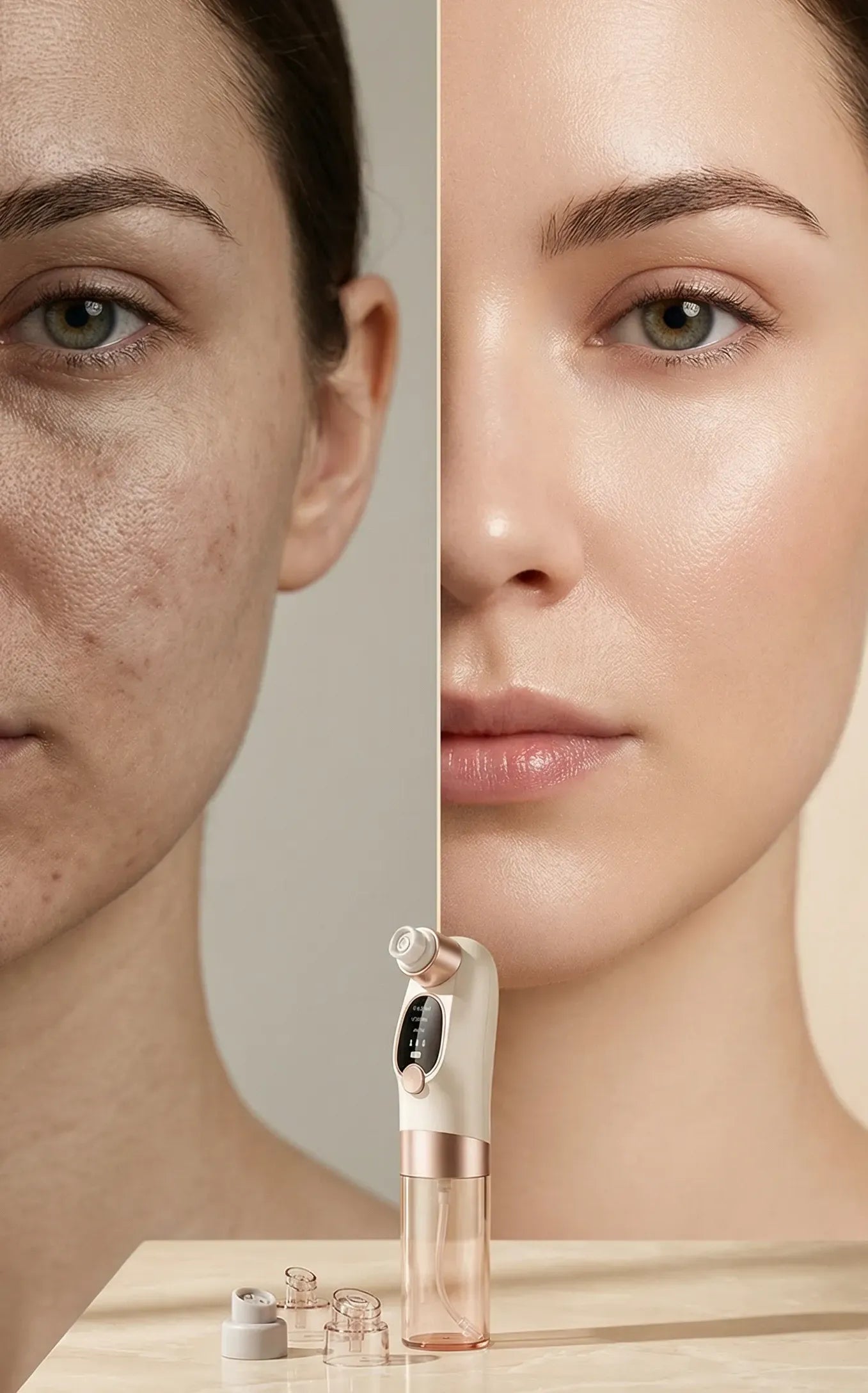 A modern facial device that removes deep impurities, excess oil and visible blackheads using intelligent suction technology, leaving your skin: